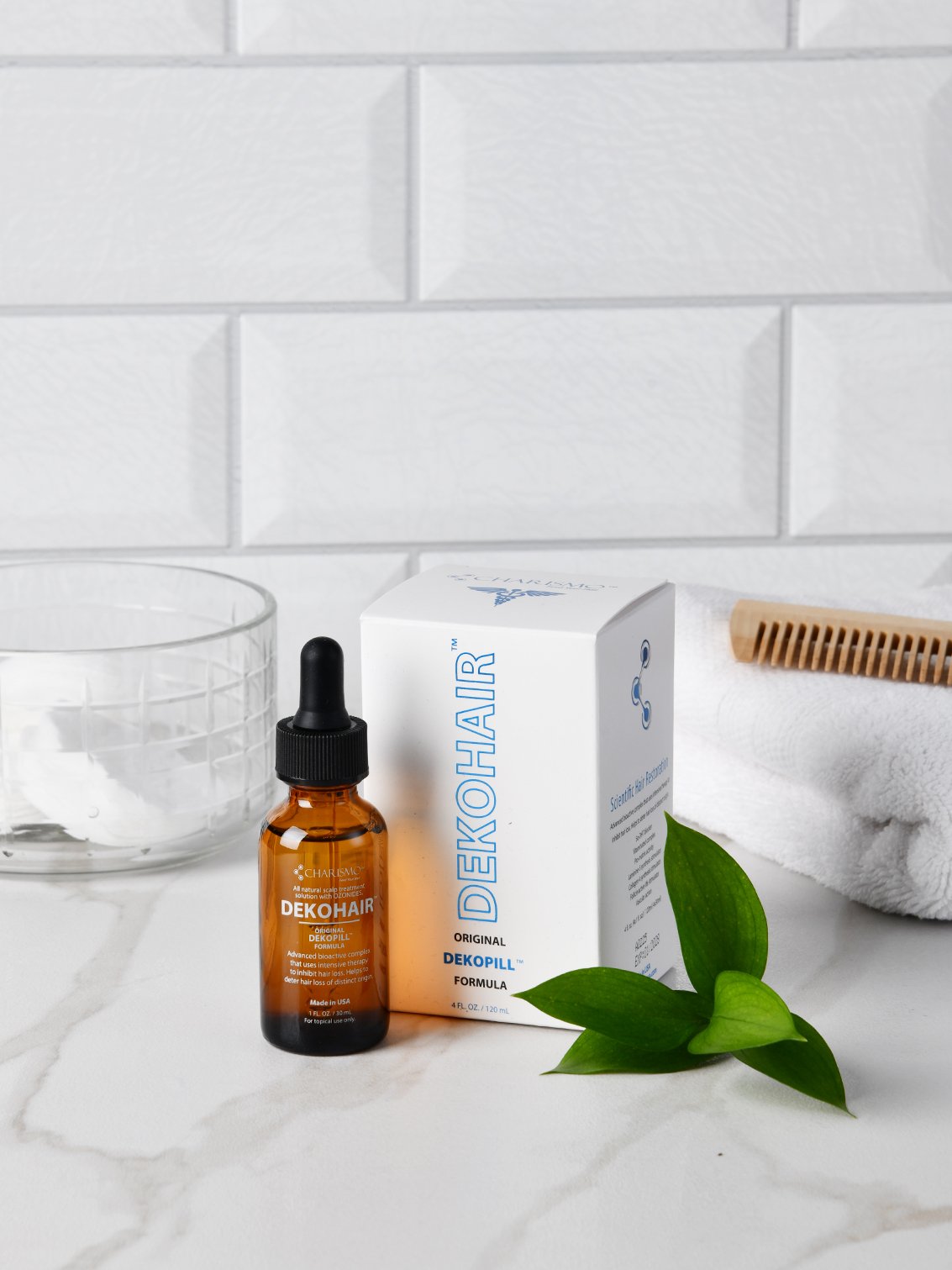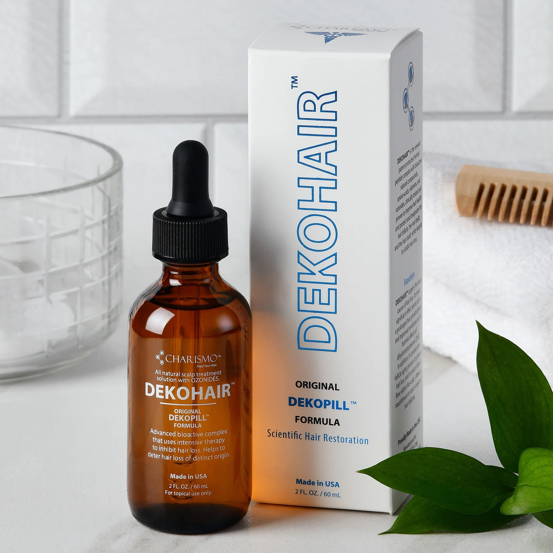 Regular shedding is normal! Most people lose about 50–100 strands each day. DEKOHAIR™ is a targeted serum formulated to support your scalp while revitalizing the appearance of thinning areas. This 120 mL bottle supplies approximately 60 days of treatment.